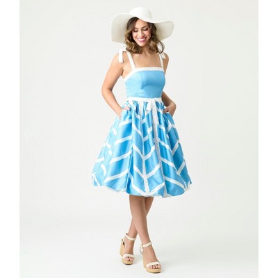 A retro flare featuring multicolor tennis rackets printed throughout the white backdrop crafted in a lightweight fabric. The halter style neckline is outfitted with a keyhole accent and secured with back buttons. The sultry back is secured with a self tie keyhole back, while the banded waistline is accented in green and nipped in with a back zipper. Complete with side pockets!