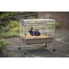 Prevue Pet Products Small Animal cage with Stand Coco & White 425 is ideal for a variety of small animals including rabbits and guinea pigs. Two large doors, one on the top and one on the side, allow you to easily access your precious pet. Tubular steel stand sits on casters so cage can easily be moved from room to room or even from indoors to outdoors. Non-toxic powder coated finish cleans up quickly while the extra deep 6 1/2 inch plastic pan contains mess.
