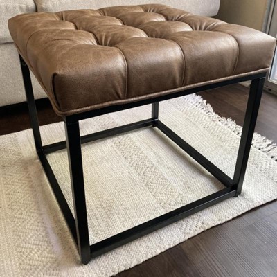 The Small Decorative Ottoman makes a statement in any room. Upholstered in a distressed, faux leather fabric, the metal legs of this stool add the perfect visual complement. Open space beneath the seat creates a light and airy effect, while intricate button-tufting detail enhances this farmhouse-inspired piece. Use as a footstool in the family room, as a coffee table in the living room, or pair two together for extra seating. Easy to assemble and maintain. Please note that fabric and wood colors may appear slightly different due to variations in lighting or screen settings.