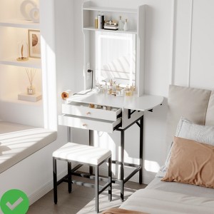 Foldable Side Panel ¨C Smart Space Extension:This compact vanity features a foldable side panel that can be opened when applying makeup for extra space and folded down when not in use¡ªperfect for flexible, space-saving use. Hair Dryer Holder,Fold-Up Panel,Compact Makeup Dressing Table for Small Bedrooms,Apartments,Tiny Space.