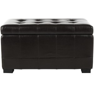 A great space saver in the family room, living room or bedroom, the small Manhattan storage bench is perfect for keeping linens, clothing, even toys and reading material out of sight. What's more, this beautiful piece is covered in brown bicast leather that's quilted with button tufting on top. A perfect perch for extra seating, Manhattan stands on chic black beech wood legs, a sturdy dual purpose must have for busy families short on space.