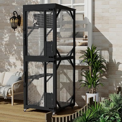 Outdoor Cat Enclosure with Wheels ¨C Small Black Walk-in Catio for Indoor/Outdoor Use, 4 Lockable Casters & Expandable Design.Product Details & SpecificationsPortable & Secure MobilityEquipped with 4 lockable caster wheels (69"L ¡Á 62"W ¡Á 32"H) for smooth indoor-outdoor transitions.Multi-Door Access SystemFeatures 2 large main doors + 2 side doors for easy entry/exit, compatible with windows or pet doors.Spacious & Comfortable DesignDurable fir wood and metal wire construction with an upgraded resting box for safe play/napping.Modular ExpandabilitySide panels can be removed to connect multiple units for expanded space (assembly instructions included).Weather-Resistant & Easy AssemblyPre-drilled parts for quick setup; built to withstand outdoor conditions.