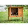 Prevue Pet Products Small Rabbit Hutch 460 provides your rabbit with a safe, secure hutch that they will be happy to call home. Crafted from a fine weather-resistant variety of fir tree lumber and coated with a protective, non-toxic stain, this rabbit hutch also features a water-resistant roof made of asphalt shingles and is designed to protect your pet from inclement weather. Our thoroughly constructed design has an open floor plan that connects to an adjoining, private nesting box area, removable interior divider walls, a fold-down entry ramp plus a foot-friendly removable bottom grille. Additional security features include a lid latch and double door locks on the front wire bird cage door. Ideal for multiple small rabbits, up to 15 lbs. or 1 large rabbit, our Small Rabbit Hutch 460 measures 36 inches long, 24 inches wide and 35 1/2 inches high.