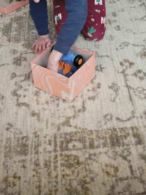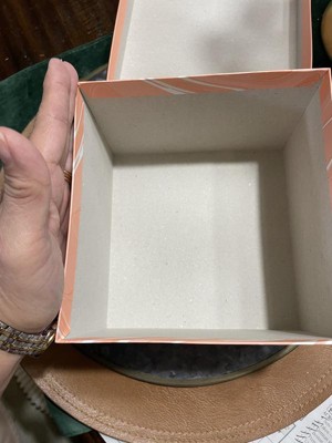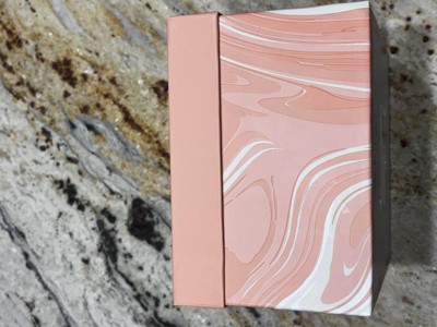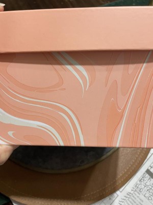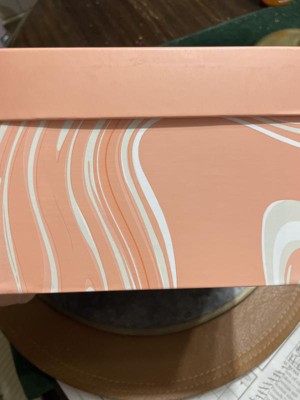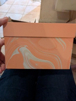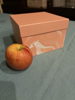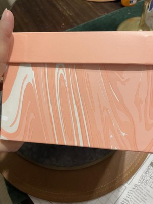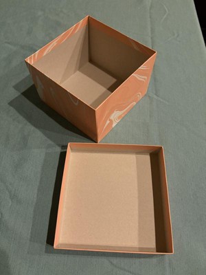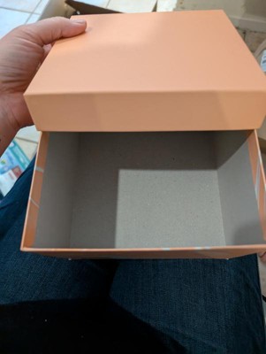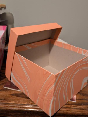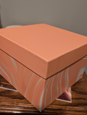 Very cute and sturdy cardboard box. Would make a cute gift box for a birthday, wedding, baby, or even just a keepsake box. It isn’t too big or too small. The peach color is cute and I like the marbling effect.