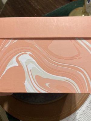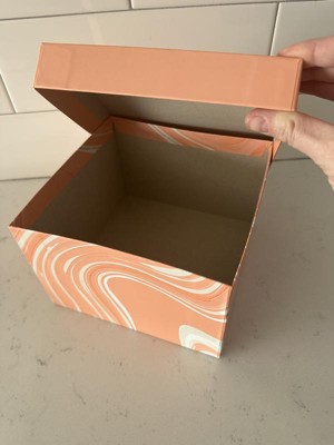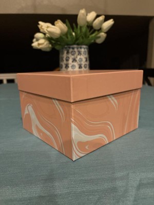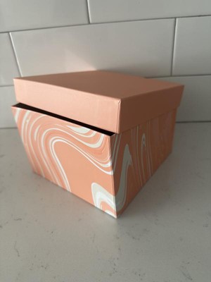 Up your gifting game with the Small Square Box Marble pattern Peach Colorway from Spritz™. Its sturdy design makes it ideal for holding small to medium-sized presents, while the charming marble pattern adds a sophisticated touch. Simple, stylish, and full of charm, this gift box is a lovely way to present your thoughtful gifts. Perfect for making any celebration extra special.