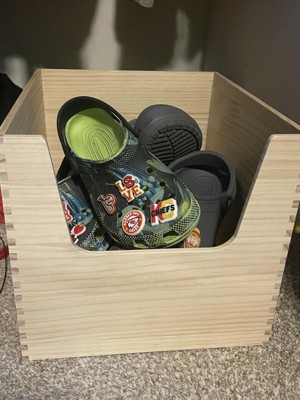 Small wood stackable storage container. This storage box is very cute and is very well made. It would hold up to any kid abuse. I also like it for storage in the pantry or would also be cut in a bathroom.