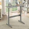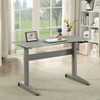 Achieve a simplistic modern look with this adjustable height desk, taking advantage of adjustable height settings. This gray finish metal, wood, and wood veneer constructed table is ideal for home office settings where flexibility is essential. A spacious top and bracket feet offer perfect balance, as a sturdy build provides security.