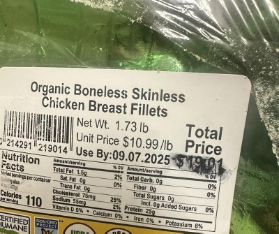 I placed a curbside pickup order and received chicken on its use-by date. I was charged $19.01, but the package had a clearance sticker for $9.00 that appeared to have been partially removed.
