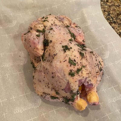 Roasts up tender and delicious, great flavor. I have purchased this product from Target many times -- always delicious. When I started buying these birds, I pulled out my unglazed Romertopf clay pot, which I highly recommend for cooking this chicken! No basting, and the result is perfection. Target's price on this product is lower than most other retailers. Often out of stock, so buy it when you see it!
