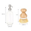 Fill the glass dispenser with dish soap or hand soap Place dispenser and brush cup onto the ceramic tray Use brush for scrubbing dishes or cookware Rinse and allow brush to air dry in cup Keep everything neatly organized on the tray