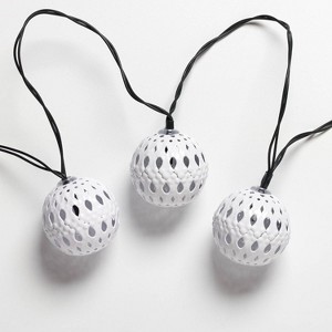 A classic topper for our string lights, the Carnivale brings an elegant pop of white to your favorite outdoor area or garden. Each 1 lumen LED is enclosed in a white painted metal topper. A 5ft lead cable allows you to place the LEDs in a shady area while the solar panel collects power in a sunny spot to charge the Ni-MH batteries. 20 LEDs with 6" between each illuminate automatically at night. Topper measures approx. 1.5" Dia x 1.5" H.