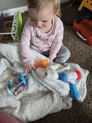 [This review was collected as part of a promotion.] These are such cute little toys and were such good stocking stuffer for christmas. It comes with 4 little toys and each toy does something different. The hammer plays music and makes noise. The two rattles are cute and one squeaks. Lastly the square one has different little things your baby can turn and play with. Small toys that are easy to take on the go. Definitely worth buying.