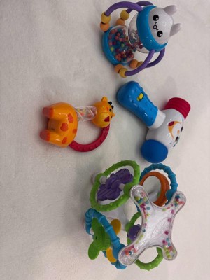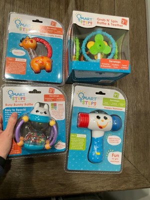 - Includes: Jerry Giraffe Rattle and Teether, Busy Bunny Rattle, Grab N’ Spin Rattle and Teether, Happy Hammer.