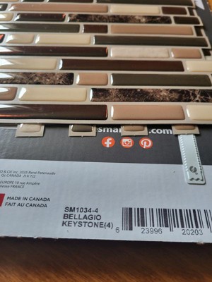 - PREMIUM QUALITY, MADE IN NORTH AMERICA: Buy from the market leader in self adhesive tiles - premium quality tiles manufactured in North America. Choose from a large selection of easy to install, high quality tile designs. The peel and stick tile Bellagio Keystone (SM1034-4) is warm and elegant. Indeed, its bronze and marble effect will obtain a subtle richness for your decor. Each pack of 4 tiles covers 2.65 sq ft (0.25 m2).