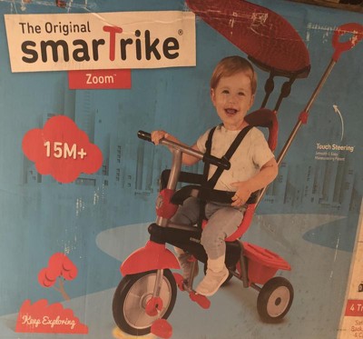 The smarTrike Zoom is the perfect solution for parents who want their little one to have a smooth, comfortable ride. This 4-in-1 trike grows with your baby from 15 months old and up, so you'll be able to use it for many years to come. The Touch Steering makes it easy to control, just touch the parent handle and the trike will move in the direction you want. The dual control mode lets you decide who's in charge; you or your little adventurer. And there's no need to worry about safety with a 3-point Y harness, removable safety bar, non-slip pedals, and a sunshade canopy. The durable EVA wheels and patented shock absorbers provide a seamless ride, while the chic design adds style to your day outdoors. This smarTrike Zoom Tricycle is a great way to spend time together, so go ahead and get ready for some fun family adventures!