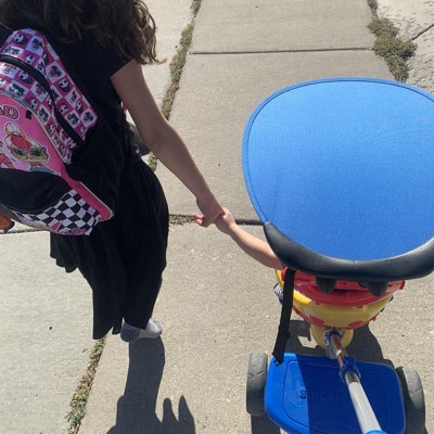 [This review was collected as part of a promotion.] I love this trike because it will grow with our 1 1/2 year old and when our baby is ready, she will be able to use this too. We love taking family walks but our toddler hates the stroller so we weren’t getting out as much until now. Adults push while the tots ride in style, at home we turn the front wheel around so our little one can peddle on her own. The trike has foot pegs that fold away for the younger ones who can’t reach the pedals when adults are pushing the trike. We love how easy it is to steer the trike using the handle when out on a walk. The canopy is so bright and colorful but it also keeps the sun from getting to the kids and keeps them drier when we get unexpected rain. This trike is a great way to get kids to enjoy walks again and it helps give them a safe fun way to learn how to pedal a bike. The safety harness can be removes as the child grows and learn how to balance on their own.