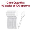 Easy to arrange and serve with a variety of hot and cold foods, these disposable plastic spoons are a great addition to any flatware collection. The case quantity of 10 packs of 100 spoons means that you'll have enough spoons to last you through the party. These elegant clear plastic spoons are a simple and easy way to serve food at your next party.