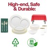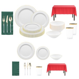 Celebrate in festive elegance with this disposable plastic dinnerware set for 20 guests, featuring white dinner plates, salad plates, and soup bowls accented with gold trim. The set includes gold-and-white flatware, clear tumblers with gold detail, red tablecloths, and hunter green napkins for a striking holiday-ready presentation. Crafted from durable BPA-free plastic, it offers the strength needed for full meals while ensuring quick cleanup. Perfect for Christmas dinners, holiday parties, weddings, or upscale gatherings, this set combines style, convenience, and durability.