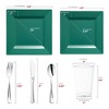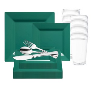 Add a touch of fashionable style to your wedding reception with this modern disposable plastic tableware value set. This comprehensive package boasts 120 dinner and 120 salad plates, each featuring a chic square shape and hunter-green design for a contemporary flair. Accompanied by 120 forks, spoons, and knives, as well as 120 12 oz. tumblers, it ensures every guest is catered to with style and convenience. Crafted from high-quality plastic, these pieces combine durability with sophistication, making them ideal for any elegant affair. With ample quantities and a striking hue, this set promises to elevate your wedding reception to new heights of refinement and luxury.