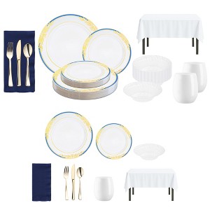 Elevate large celebrations with this disposable plastic dinnerware set for 60 guests, designed with white plates accented in blue and gold for timeless sophistication. The collection includes 10.25" dinner plates, 7.5" salad plates, 5 oz. clear dessert bowls, elegant gold flatware, navy napkins, white tablecloths, and durable white cups paired with premium wine glasses for drinks. Made from strong, BPA-free plastic, this set is sturdy enough for full meals while offering the convenience of single-use cleanup. Perfect for weddings, banquets, birthdays, anniversaries, and upscale holiday gatherings, it delivers both style and practicality for large events.
