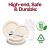 Make your wedding day truly memorable with this all-inclusive disposable plastic tableware value set, designed to impress and delight your guests with its grace and refinement. This comprehensive set features 120 dinner plates, 120 salad plates, 120 forks, 120 spoons, 120 knives, and 120 12 oz. tumblers, ensuring a seamless and elegant dining experience for all guests. The timeless ivory color, paired with a vintage-inspired round design, adds a touch of sophistication to your tablescape. Made of high-quality plastic, these disposable pieces offer the convenience of easy cleanup without compromising on style or durability.