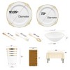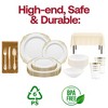 Host unforgettable events with this disposable plastic dinnerware set for 60 guests, featuring elegant white dinner plates, salad plates, and soup bowls accented with luxurious gold trim. The set includes premium gold flatware, clear tumblers with gold detail, ivory tablecloths, and gold napkins for a coordinated and upscale presentation. Crafted from durable, BPA-free plastic, this banquet-size collection is strong enough for hearty meals while offering the convenience of single-use cleanup. Perfect for weddings, banquets, anniversaries, holiday dinners, and other formal celebrations, it combines timeless style with practicality.