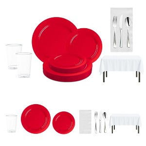 Add a bold, festive touch to your table with this disposable plastic dinnerware set for 20 guests, featuring vibrant red dinner plates and salad plates paired with sleek silver flatware. Clear cups, crisp white napkins, and matching white tablecloths complete the coordinated setup for a polished look. Made from durable BPA-free plastic, this set offers the strength to handle full meals while ensuring quick and easy single-use cleanup. Perfect for Christmas dinners, Valentine’s Day, birthdays, and holiday gatherings, it blends eye-catching color with practical convenience.