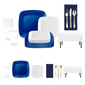 Serve your guests in style with this banquet-size disposable dinnerware set for 60 guests, featuring bold blue buffet plates, crisp white salad plates, and elegant gold flatware. The set also includes clear cups, navy napkins, and white tablecloths for a clean, coordinated look that suits any occasion. Made from durable BPA-free plastic, this collection is sturdy enough for full meals while offering the convenience of single-use cleanup. Perfect for weddings, graduations, birthdays, and holiday parties, it blends vibrant color with classic elegance for large celebrations.