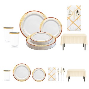 Make a lasting impression at your next event with this luxury disposable dinnerware set for 60 guests, featuring white dinner and salad plates detailed with rich burgundy and shimmering gold. The set includes stylish gold-and-white flatware, clear tumblers with gold rims, ivory tablecloths, and coordinating white napkins with gold accents to create a polished and festive tablescape. Crafted from durable BPA-free plastic, this set delivers the sophistication of fine china with the ease of disposable cleanup. Perfect for weddings, holiday celebrations, banquets, and upscale dinner parties, it ensures your large gathering is both elegant and effortless.