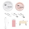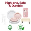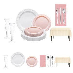 Host a flawless event with this disposable dinnerware set for 60 guests, featuring elegant white dinner plates paired with charming pink salad plates and polished silver flatware. The set includes ivory tablecloths, matching pink napkins, clear cups, and classic champagne flutes for a coordinated, upscale look. Crafted from premium BPA-free plastic, this set offers the refined appearance of real tableware with the convenience of single-use, making it perfect for weddings, bridal showers, birthdays, banquets, and holiday parties.