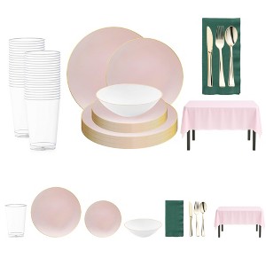 Celebrate in style with this service for 20 pink with gold dinnerware set, featuring dinner plates, salad plates, and dessert bowls accented in elegant metallic trim. Coordinated with gold flatware, pink tablecloths, hunter green napkins, and clear cups, this set brings sophistication and vibrant charm to weddings, birthdays, showers, and special events. Made from durable, BPA-free plastic, it combines upscale design with easy cleanup for a stress-free hosting experience.