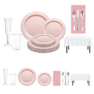 Host unforgettable events with this service for 60 pink and white dinnerware set, designed for birthdays, bridal showers, baby showers, and elegant parties. It includes sturdy white dinner plates, pink salad plates, and matching pink flatware, paired with pink tablecloths, white napkins, and clear cups for a polished and coordinated look. Made from BPA-free, durable plastic, this disposable set combines elegance with convenience, making setup easy and cleanup effortless so you can focus on celebrating.