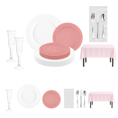 Host large gatherings in style with this service for 60 dinnerware set featuring white with gold plates and silver flatware. Designed for elegance and convenience, the set includes dinner plates, salad plates, dessert forks and spoons, full cutlery, napkins, navy cups, wine glasses, and coordinating navy tablecloths. Each piece is crafted from durable BPA-free plastic that mimics fine china while ensuring easy cleanup. Perfect for weddings, corporate events, anniversaries, or family celebrations, this collection brings timeless sophistication to any occasion.
