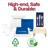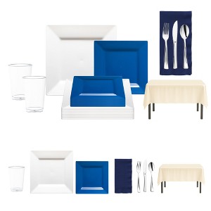 Serve up elegance at your next event with this service for 60 disposable dinnerware set. Featuring white dinner plates, midnight blue cake plates, and silver flatware, this set is paired with ivory tablecloths, navy blue napkins, and clear cups for a refined tablescape. Perfect for weddings, receptions, banquets, anniversaries, and large gatherings, the set combines durability with convenience. Crafted from BPA-free plastic, it ensures a sophisticated look with effortless cleanup after your celebration.