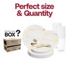 Create a wedding reception to remember with this elegant disposable plastic wedding value set. This extensive set includes 120 dinner plates, 120 salad plates, 120 forks, 120 spoons, 120 knives, and 120 12 oz. tumblers, ensuring ample supplies for your guests. This exquisite disposable set features a sophisticated white design with elegant gold marble strokes, adding a touch of luxury to your table decor. Crafted from high-quality disposable plastic, this set offers durability and convenience without sacrificing style. Simplify your wedding planning and elevate your dining experience with this all-inclusive value set, making your special day unforgettable.