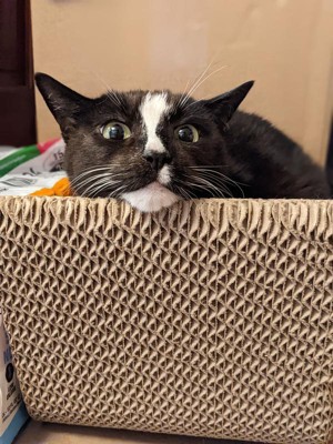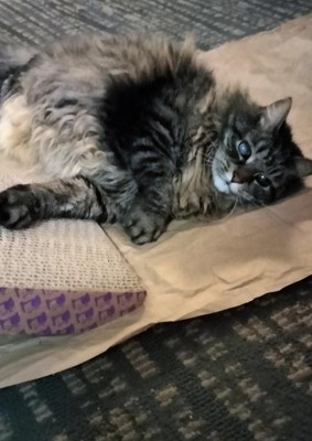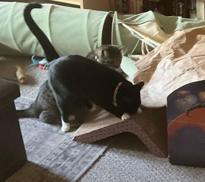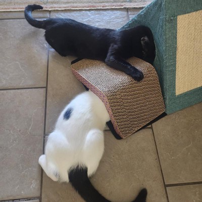 [This review was collected as part of a promotion.] I honestly didn’t put too much thought into getting this scratcher. I generally keep scratchers around, placed strategically to encourage no interest in my furniture. But my three male cats love this thing! My horizontal scratcher stands at the top of the bend and scratches downward and my two vertical scratchers stand at the bottom and scratch forward. These two use it to hide under to play with each other as well. I’ll always keep a couple Scratch Ladders around from now on, they love it so much!