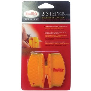 The Smiths 2-step knife sharpener features two tungsten carbide blades with pre-set angles, ensuring a perfect edge every time. To restore the edge on a very dull knife, simply make three to four strokes through the carbide sharpening slots. For knives that are already sharp, the two crossed ceramic rods—also with pre-set angles—provide a smooth and polished finish.