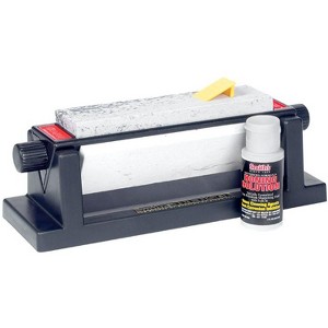 Smith's 3-stone sharpening system includes a 6-inch medium Arkansas stone, a 6-inch fine Arkansas stone, and a 6-inch coarse synthetic stone, all mounted on a molded plastic triangle. It features handles on the ends for easy stone rotation and clear identification of the stones. The durable molded plastic base has non-skid rubber feet for safety, a "V" trough to catch oil drippings, and is easy to clean.