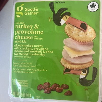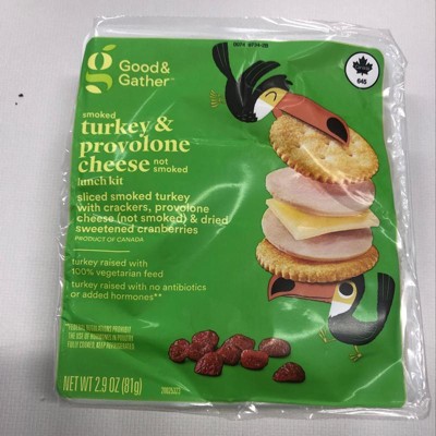 The Smoked Turkey and Provolone Cheese Lunch Kit from Good & Gather™ makes a perfect on-the-go lunch choice, whether you're headed to the beach, out for a casual picnic or getting ready for a long flight. This meat and cheese lunch kit includes smoked turkey, colby cheese and snack crackers that will hit the spot, and it even comes with chocolate chip button cookies for a little bit of sweetness. The turkey is raised without antibiotics and growth hormones*, making this an easy lunch choice you can feel good about. *Federal regulations prohibit the use of hormones in poultry.