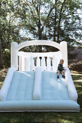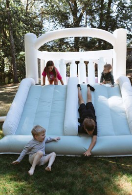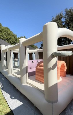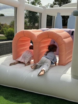 Smol Course features double tunnels and slides, a climbing wall with foot holds, dangling obstacles, a basketball hoop, and plenty of room to jump. Parents love its modern design and color palette, and kids love the adventures they have inside. Smol Course inflates in minutes and is easy to store. Make any backyard party of playdate one to remember with Smol Course!