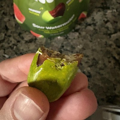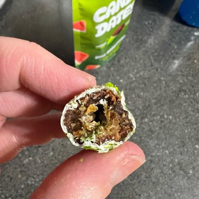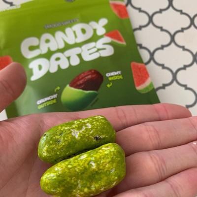 [This review was collected as part of a promotion.] I love dates and wasn't sure what to expect, so these were interesting to say the least. The shell does taste like sour watermelon candy and is a bright green color so kids might like these. The shell, unfortunately, totally covers up any date flavor. There were only 12 pieces in the bag so a little pricey for just a few servings.