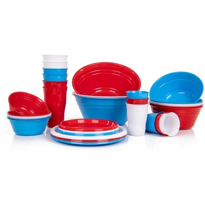 38 Piece Includes: 6 - 21oz Cups 6 - 11oz Cups 6 - 6.5in Round Plates 6 - 8.5in Round Plates 6 Small Bowls - 975ml 6 Medium Bowls - 1.8L 2 Large Bowls - 4L