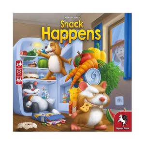 Finally, the humans are gone and the animals are free. Time to raid the fridge! One by one the family animals bring delicious snacks like melon, cake, and peppers to their hiding place. Who can fill their stash the fastest?In Snack Happens, players take on the roles of a cat, mouse, dog, and parrot, whose goal is to fill their secret stash as full as possible with treats. To do this, the active player throws wooden chips as accurately as they can into the bottom box lid, which represents the refrigerator. Afterwards, depending on where the chips landed, the active player may choose to perform a matching action. All the other players in turn may then also choose and perform one of the actions marked by the thrown chips. Each new round, the next player around the table takes a turn tossing the snack chips into the fridge. The special actions Snack Box and Mixer provide additional excitement in this exciting children's game.