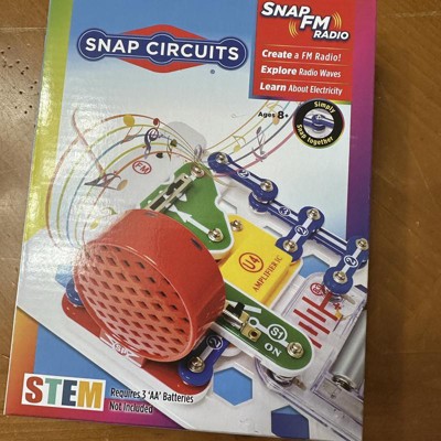SNAP CIRCUITS: FM RADIO Build your very own FM radio! Snap FM is an entry level STEM Toy that provides hands-on learning and fun! This kit provides valuable and practical STEM learning experience for your child and all kids to enjoy. SNAP FM includes easy to follow directions that allow kids to work independently, build confidence, and learn how a radio works. GREAT GIFT Give the gift of learning and fun this holiday season! Snap Circuits kits will keep kids busy and having fun all year round. Combine with other Snap Circuits kits for even more projects! NO EXTRA TOOLS NEEDED. Snap Circuits kits include everything you need to start learning immediately - and more. Hands on electronic learning for children ages 8+. Requires Three (3) AA Batteries not included.