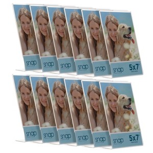 The Snap 4x6 Clear Acrylic Self Standing Frames offer a modern and affordable solution for displaying your cherished photos, marketing signs, or table settings. Their versatile L-shaped design allows them to stand both horizontally and vertically, providing flexibility for your display needs. Crafted from lightweight yet durable crystal-clear acrylic, these frames not only protect your memories or artwork but also add a sleek and modern touch to any space. Each frame holds a ''5x7'' inch photo or image, making them ideal for showcasing your favorite memories or promoting your business. The simple yet modern design of these frames makes them perfect for any decor or upcoming event. Whether you're planning a wedding, baby shower, or need advertising for your front desk or restaurant, these frames are versatile enough to suit any setting. Each purchase includes 12 frames, ensuring you have plenty to create stunning displays for your photos or marketing materials. Upgrade your display with the Snap ''5x7'' Clear Acrylic Self Standing Frames and showcase your memories or promotions in style.
