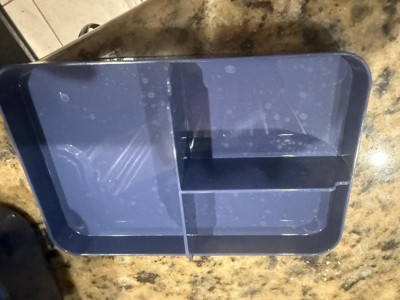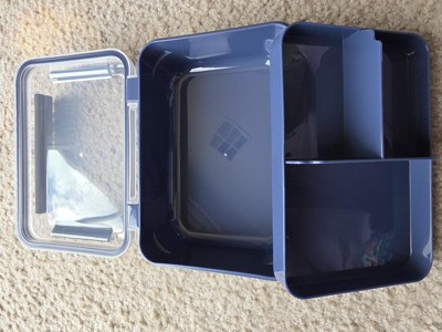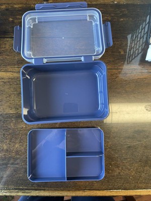 I originally thought this little blue divided bento box wouldn't really be useful for anything but it is surprisingly larger than it looks. It has a leak proof clasp lid and a divided tray on the top tier and just a bigger opening on the bottom tier. Because the lid is a bit domed, the spaces in the divided tray hold alot more than you think. We don't pack lunch for school as both my boys buy lunch BUT we do spend hours and hours at ballfields all over the state. This bento box is a perfect way to pack snack and keep them separated without having to bring separate containers or bags of each item. We usually bring cheese, crackers, fruit and chips or pretzels for my boy to munch on between games and this box holds the perfect amount without crushing any of the fruit or crackers. It is the perfect size for easily fitting into out cooler to keep it chilled. It is dishwasher safe, not warping of the plastic, although the top did come out with a few spots from the water drying on it but that is easily remedied. My son likes the color and the ease of opening it. I reccomend this Bento Box.