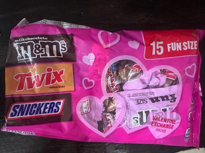 - This Valentine's Day chocolate assortment includes fun size SNICKERS Chocolate Candy Bars, TWIX Candy Bars and M&M'S Milk Chocolate Candy packs