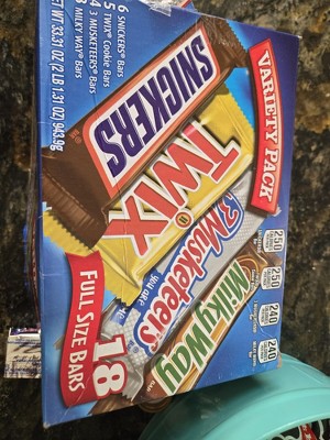 - Contains one 33.31-ounce, 18-count box of full-size, individually wrapped SNICKERS, TWIX, 3 MUSKETEERS and MILKY WAY Milk Chocolate Bars Bulk Pack