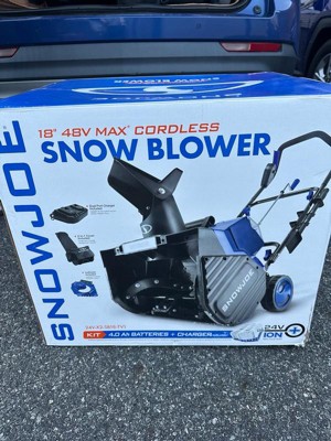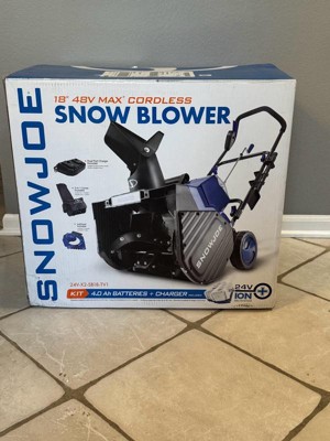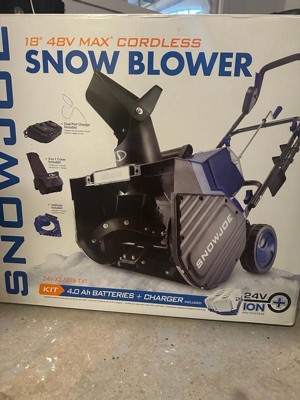 Snow Joe 48V Cordless Electric Snow Blower Kit, 1200W Brushless Motor, 18" Clearing Path - 20' Throw w/Cover, Ice Scraper & Headlight, 24V-X2-SB18-TV1