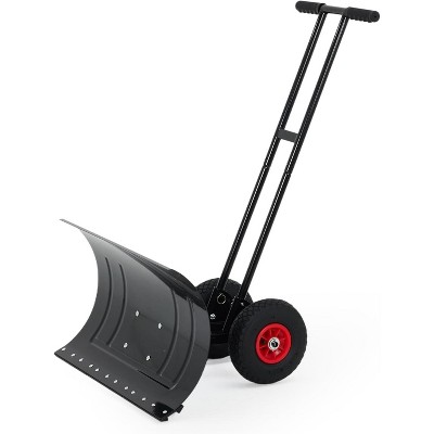Snow Pusher with Wheels, Heavy Duty Steel Blade, Adjustable Angle & Height Handle for Effortless Driveway Snow Removal